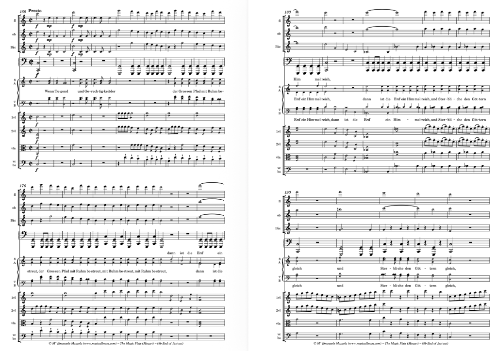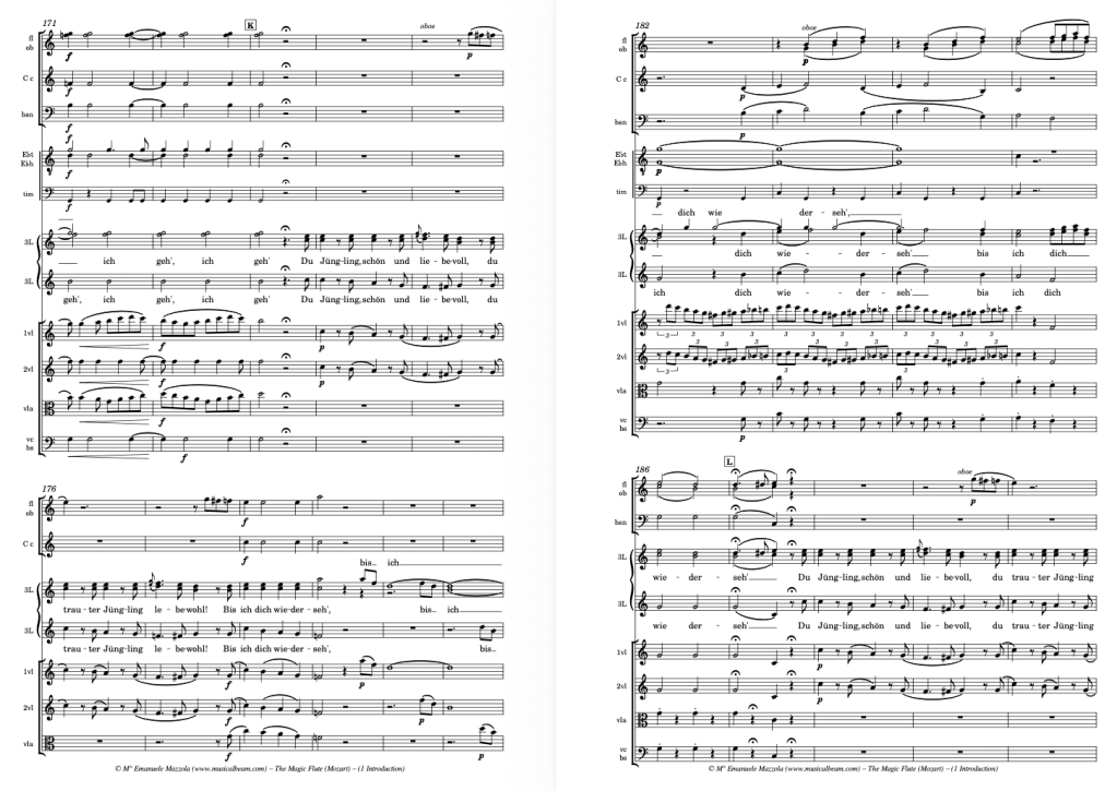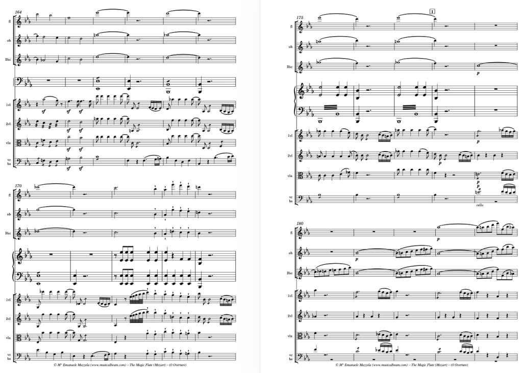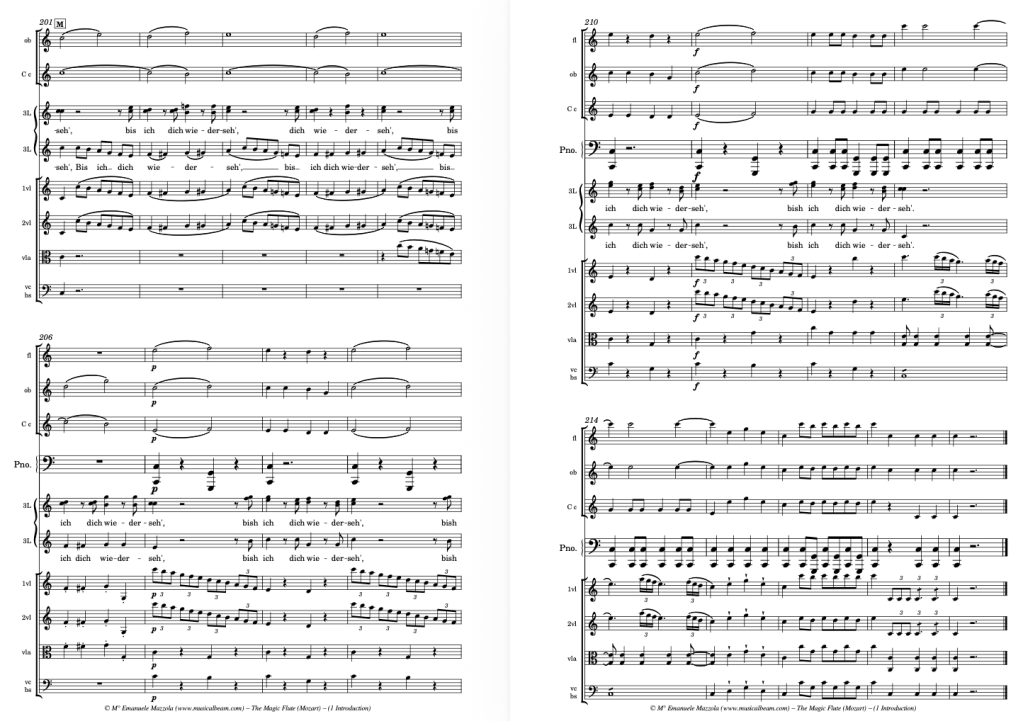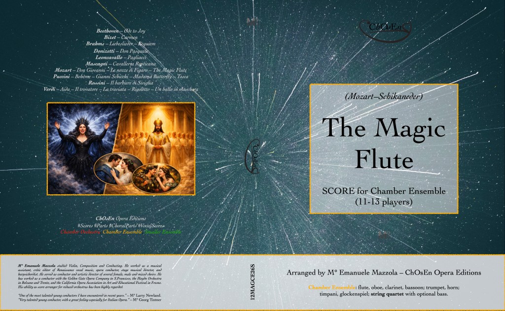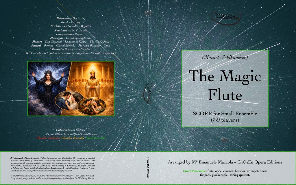 The Smaller Ensemble version is designed for maximum reduction without compromising musical integrity. It features a string quartet, three woodwinds, and piano. The piano part is not a vocal score, but a fully notated performance part, often playable with one hand, intended for the conductor or a designated player. It reinforces the ensemble in forte and fortissimo sections, ensuring depth and rhythmic clarity. With its balanced orchestration across winds, strings, and keyboard percussion, this version requires no special adjustments and offers a complete and practical solution for venues with limited resources or space. The Magic Flute for Smaller Ensemble is under preparation and will require: