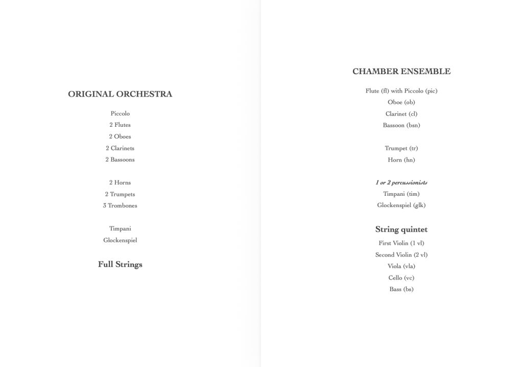 With only one player per string part, careful attention must be given to sound balance. Unlike the Chamber Orchestra version, which includes a fuller string section, the reduced string forces can be easily overpowered by winds or percussion. We recommend subtle amplification of the strings where possible, or alternatively, strategic dynamic adjustments—such as reducing wind and percussion volume—to maintain clarity and ensemble blend. The Magic Flute for Chamber Ensemble is under preparation and will require: