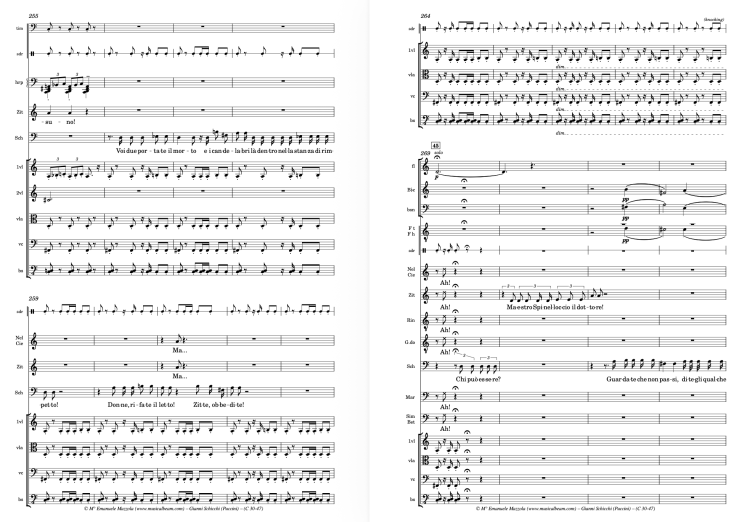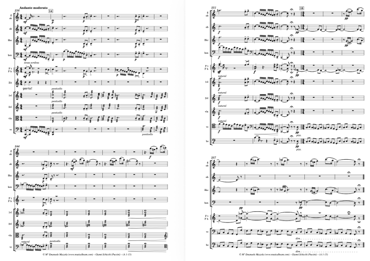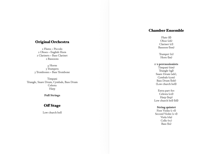 The Smaller Ensemble version is designed for maximum reduction without compromising musical integrity. It features a string quartet, three woodwinds, and piano. The piano part is not a vocal score, but a fully notated performance part, often playable with one hand, intended for the conductor or a designated player. It reinforces the ensemble in forte and fortissimo sections, ensuring depth and rhythmic clarity. With its balanced orchestration across winds, strings, and keyboard percussion, this version requires no special adjustments and offers a complete and practical solution for venues with limited resources or space. Schicchi for Smaller Ensemble is under preparation and will require: