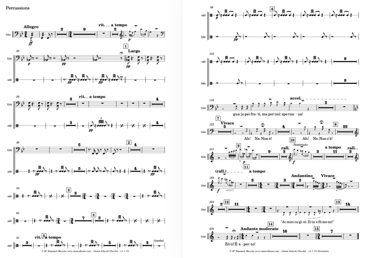 With only one player per string part, careful attention must be given to sound balance. Unlike the Chamber Orchestra version, which includes a fuller string section, the reduced string forces can be easily overpowered by winds or percussion. We recommend subtle amplification of the strings where possible, or alternatively, strategic dynamic adjustments—such as reducing wind and percussion volume—to maintain clarity and ensemble blend. Gianni Schicchi for Chamber Ensemble requires: