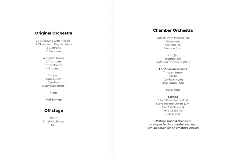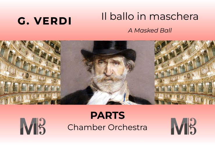 Verdi scored Un Ballo in Maschera for a full Romantic orchestra: strings, woodwinds (including piccolo and bass clarinet), brass (four horns, three trombones, trumpets), timpani, harp, and onstage banda, with significant choral involvement. The opera requires around 50–60 instrumentalists in full orchestration. While musically rich and layered, Ballo can be adapted for chamber productions, especially in smaller venues. Some elements—such as the ball scene—benefit from reduced orchestration that maintains dramatic focus without overwhelming the intimacy of the emotional conflicts. Un Ballo in maschera for Chamber Orchestra requires: