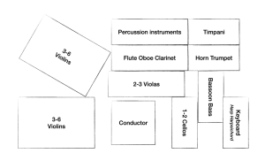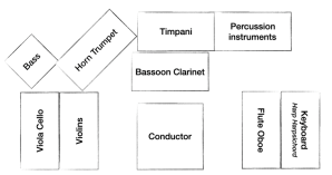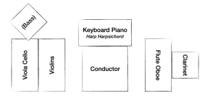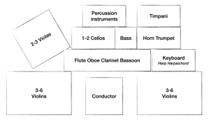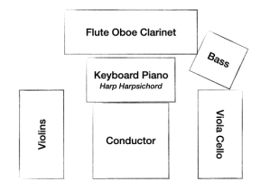 The orchestral layout in the image above suits Romantic operas (Verdi, Puccini). For Classical works (Mozart), you may wish to place the second violins on the conductor’s right (swapping positions with viola and cello) and to have the keyboard (harpsichord) either played by the conductor or positioned appropriately within the ensemble.
