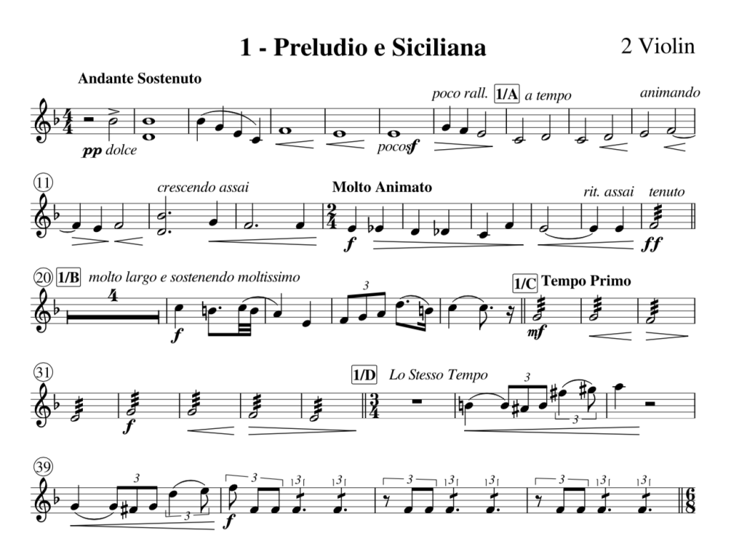 Flute (Piccolo), Oboe, Clarinet, Bassoon; Horn, Trumpet; one Percussionist; 2 Violins, Viola, Cello, Double Bass. Percussions: Timpanis, Bass Drum, Cymbals, Snare Drum, (optional) Tam Tam. Other parts included: Harps, Bells, Organ.