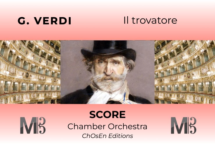 Verdi scored Il Trovatore for a standard Romantic orchestra: strings, pairs of woodwinds, four horns, two trumpets, three trombones, timpani, bass drum, and offstage banda, along with harp and chorus. The orchestration is powerful, but not unusually large, typically involving 50–60 musicians. Though richly scored, the opera’s robust vocal lines and clear textures allow for effective chamber adaptations. Smaller productions with 30–40 players have succeeded in conveying the opera’s dramatic tension without losing its impact. Trovatore for Chamber Orchestra requires: